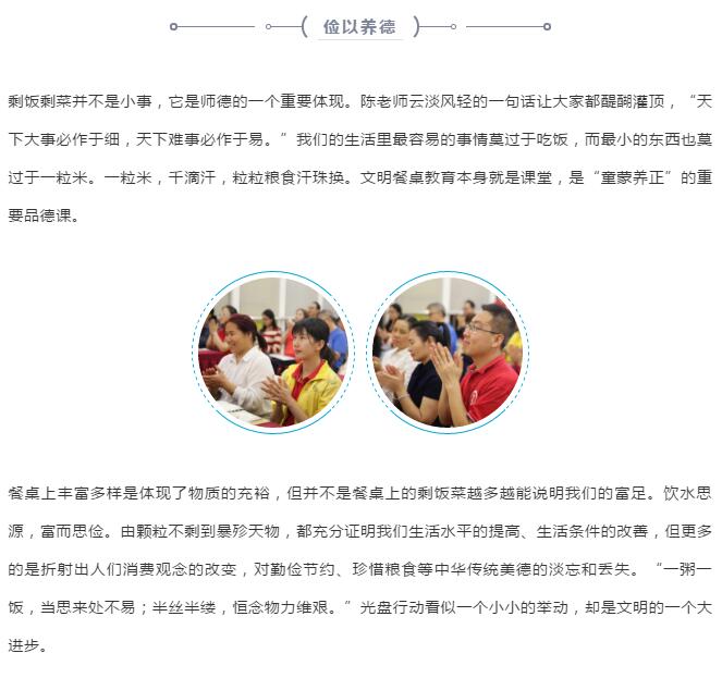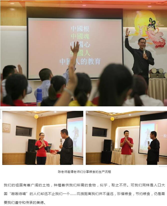 幼儿园教师成长课堂我们有幸邀请到资深传统文化专家陈阳明老师为大家分享《一粒米,千滴汗》暨“文明餐桌 光盘行动”启动仪式。让我们一起来回顾一下活动的精彩现场吧。