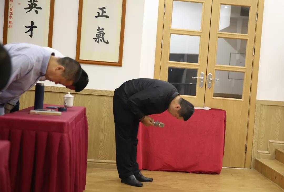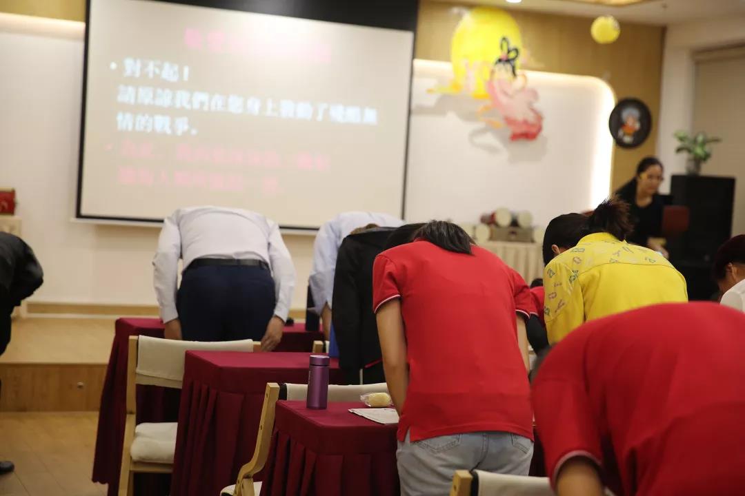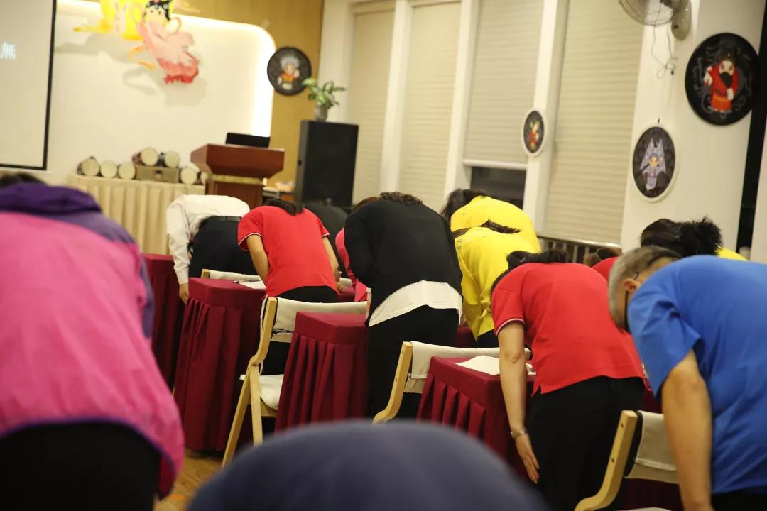 在陈老师的带领下,全体教职工向地球母亲致歉,深深地三鞠躬忏悔自己为地球母亲造成的困扰、污染和浪费,并庄严宣誓做好“光盘行动”。